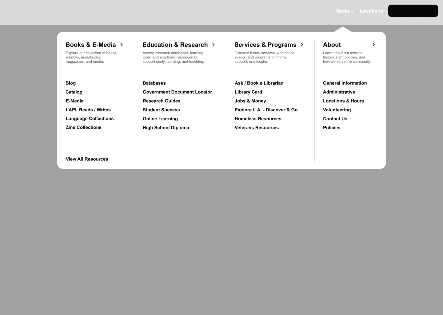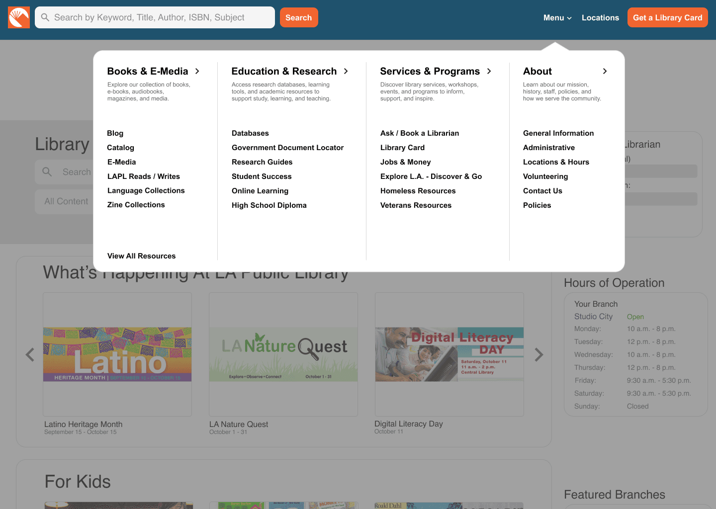 to the megamenu, branch locations, and library card information, supporting seamless navigation